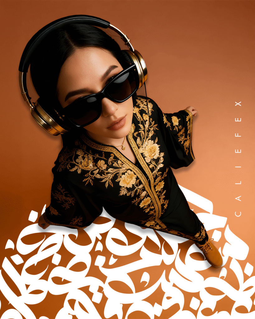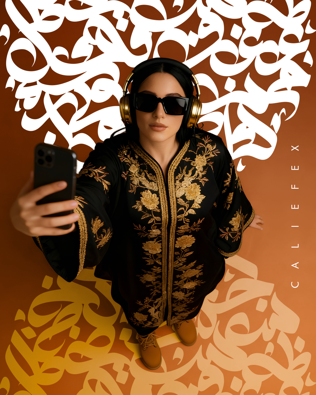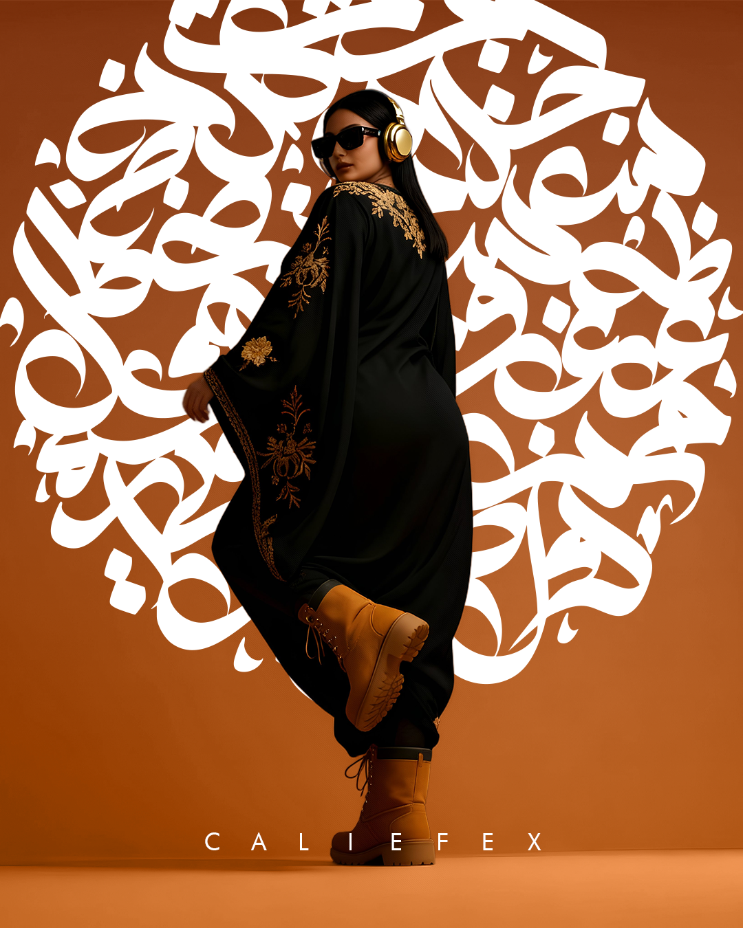 Woman wearing a black abaya with gold patterns in front of arabic calligraphy