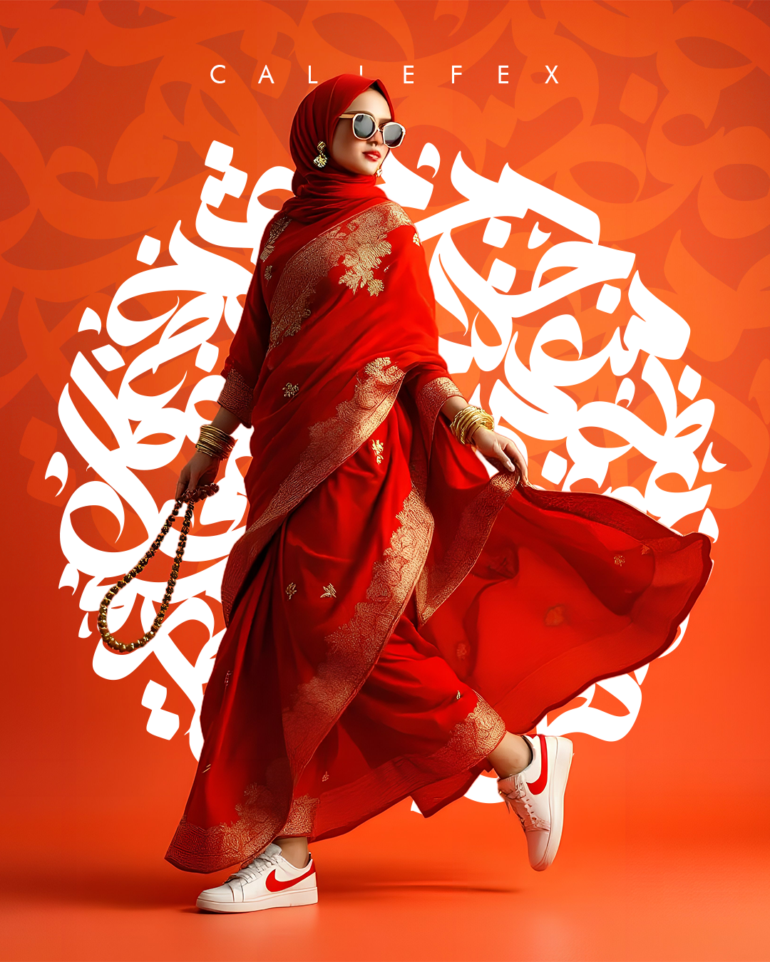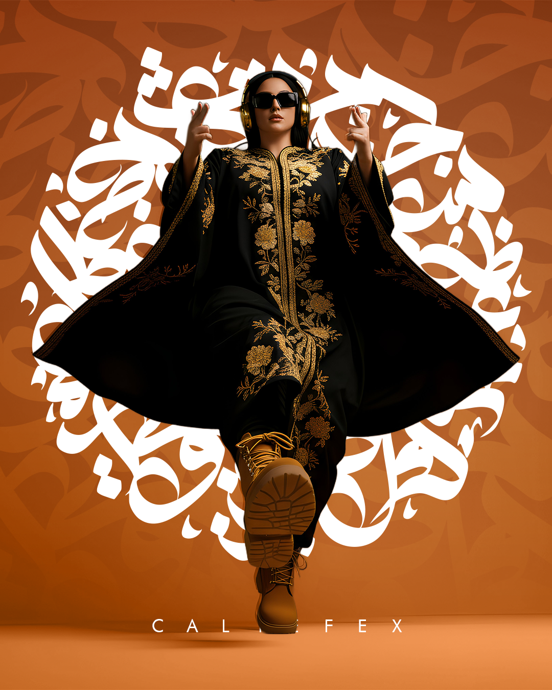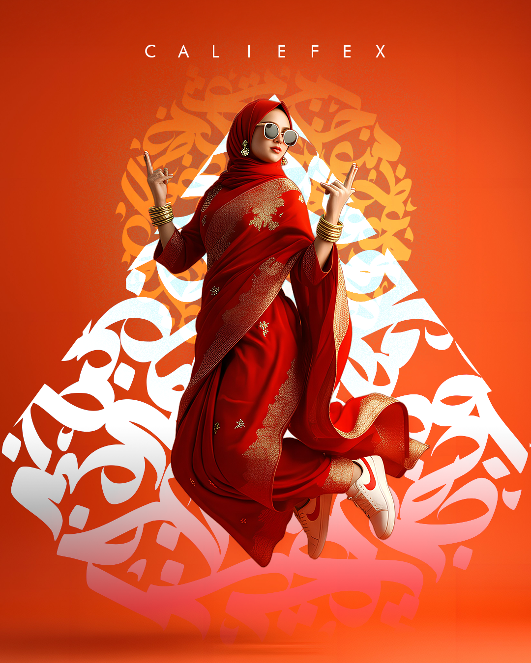 Woman jumping in the air wearing blue abaya with sunglasses and converses in front of arabic calligraphy